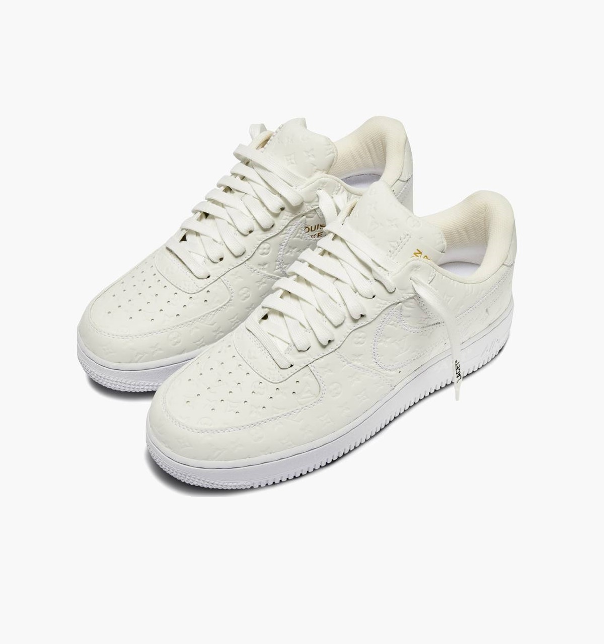The Nike Air Force 1 Low Louis Vuitton White Damier Azur are entirely made of leather, embellished with the emblematic Louis Vuitton Monogram and Damier motifs with natural cowhide profiles. Each pair is sold with a Louis Vuitton pilot case, also from the Louis Vuitton Spring-Summer 2022 collection, which has been reinterpreted from the Maison’s archive in an iconic orange color and made of Monogram Taurillon leather. The case features Louis Vuitton’s classic S-lock closure with white metal trim and includes a Nike Swoosh-shaped luggage tag. The case adapts to every shoe size, based on an internal cushioning system – created and also exclusively for this sneaker.
